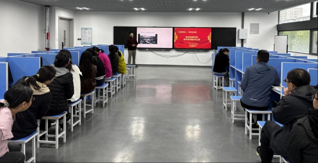 10月11日下午两点半,集成电路学院为期五天的青年教师教学比赛正式拉开帷幕,首阶段赛事作为学院重点教研活动同步开展,全体教师到场观摩,共同见证赛事启动。本次比赛聚焦教学能力提升与教学创新实践,为青年教师搭建了展示教学风采、交流育人经验的优质平台,学院全体教师到场观摩学习。比赛现场氛围热烈而有序,李辉、赵宁宁、李婉莹、赵善超四位青年教师依次登台展示,呈现了四堂各具特色的高质量教学课例。