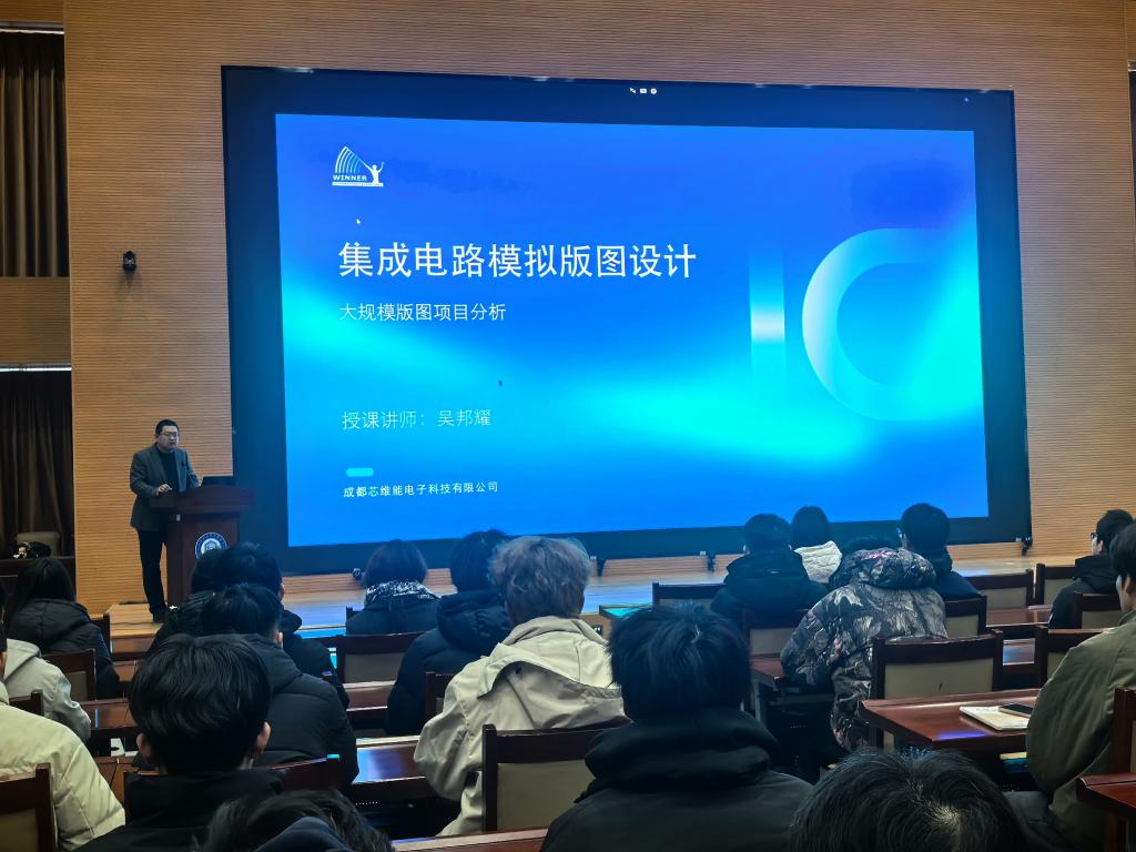 2025年11月18日上午10:00至11:30,集成电路学院特邀成都芯维能电子科技有限公司工程师吴邦耀,为集成电路专业学子带来题为《集成电路模拟版图设计》的专题公开课。本次活动旨在搭建校企协同育人桥梁,将产业一线实践经验引入课堂,助力学生夯实专业基础、明晰行业需求。